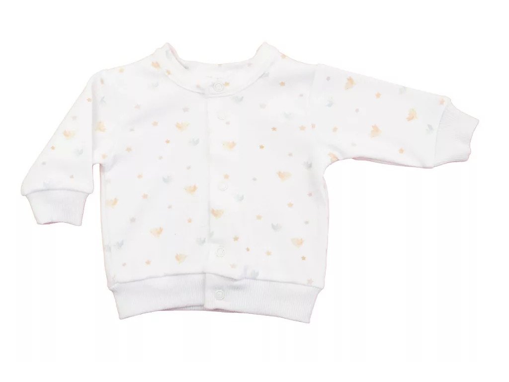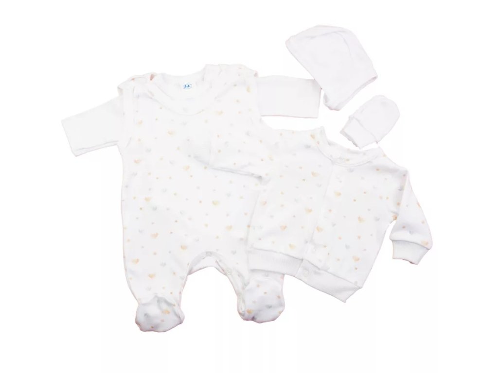 Balenie obsahuje detské dupačky bez rukávov s patentným gombíkom na ramenách a potlačou vzoru vtáčikov, jednofarebné detské body s dlhým rukávom a patentným gombíkom na ramenách a detskú mikinu do kočíka s potlačou vzoru vtáčikov s patentným gombíkom vpredu, ktoré budú perfektnou voľbou na chladnejšie dni. Detská čiapočka a detské rukavice, ktoré sú súčasťou balenia, dotvárajú túto elegantnú súpravu. Všetky diely sú vyrobené zo 100 % bavlny, čo zaisťuje mäkké a pohodlné nosenie pre dieťatko. Tento maďarský výrobok je triedy I a zapínanie bez obsahu niklu použité vo výrobku nespôsobuje alergické reakcie u detí citlivých na nikel.