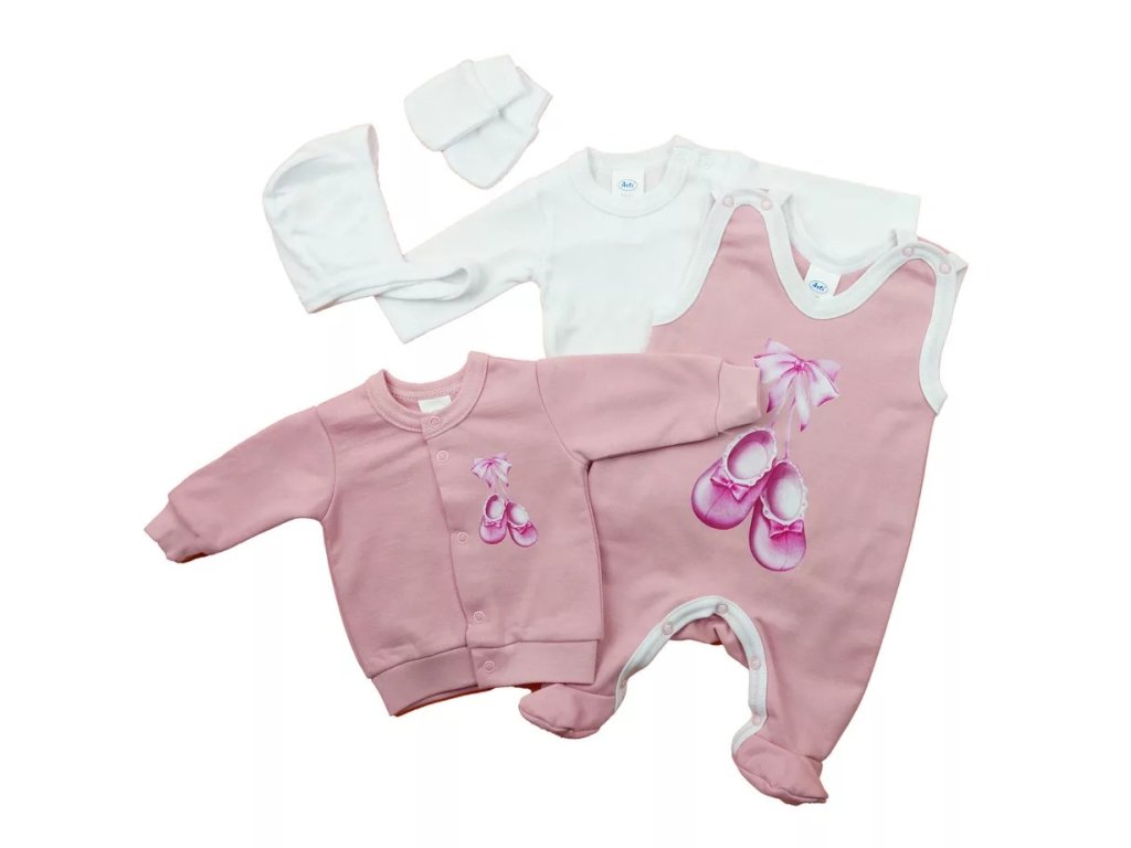 Táto 5-dielna súprava je veľmi roztomilá a obsahuje bundu na kočík, dupačky bez rukávov, body s dlhým rukávom, čiapočku a detské rukavice. Súprava je vyrobená z bavlneného materiálu, ktorý je priateľský k bábätkám a ľahko sa udržiava. Vďaka prateľnému, farbe a tvaru si zaručene obľúbia mamičky!