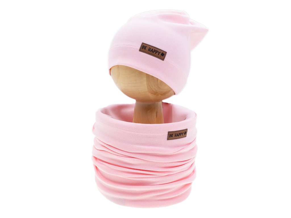 Súprava pozostávajúca z čiapky a šálu v ružovej farbe. Vyrobená z bavlny s pridaným elastanom, materiál je certifikovaný podľa normy Oeko-Tex Standard 100. Oba kusy sú zdobené nášivkou z eko kože. Vynikajúca voľba na jar aj jeseň. Materiál je mäkký a elastický, takže zabalí a ochráni hlavu a krk vášho dieťatka pred vetrom a chladom.