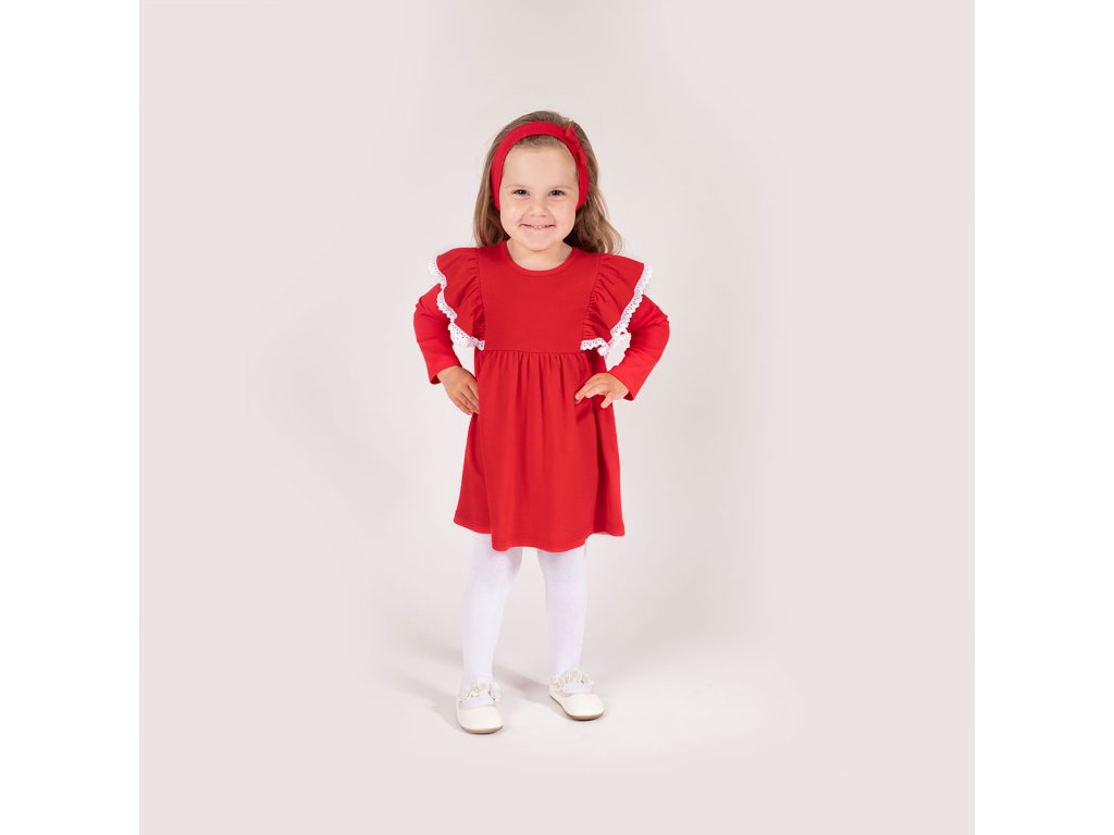 Elegantné šaty s dlhým rukávom v krásnej červenej farbe, vyrobené z bavlny. Ozdobné motýle na ramenách zakončené bielou čipkou, vzadu zapínanie na patentný gombík bez obsahu niklu. Rozparok. Spodná časť šiat je nariasená v sedle, vďaka čomu krásne sedia. Ideálne na dôležité príležitosti, napr. sviatky. Materiál, z ktorého sú vyrobené, má certifikát Oeko-Tex Standard 100 Trustworthy Textiles. Zloženie: 100% bavlna.