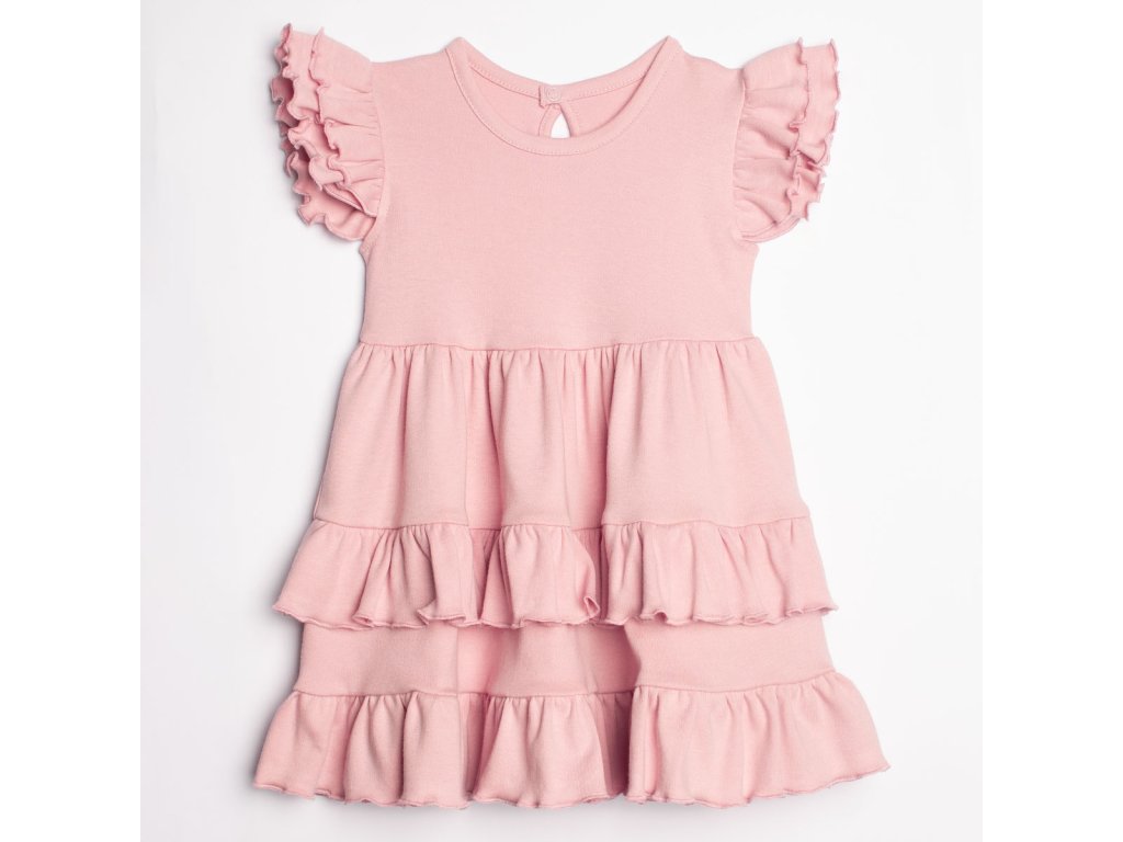 Štýlové šaty s krátkymi motýlími rukávmi. Vyrobené zo 100 % bielej bavlny, materiál je úplne bezpečný pre detskú pokožku a certifikovaný podľa normy Oeko-Tex Standard 100 (Trustworthy Textiles). Majú volán na sedle a dva volániky na leme. Zapínanie v tvare slzy s patentnými cvočkami bez obsahu niklu vzadu uľahčuje obliekanie vášho drobčeka. Ideálne na rôzne príležitosti, odporúčané pre malé slečny.