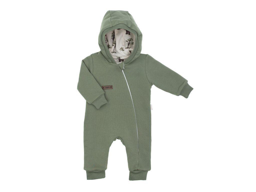 Podšitý overál pre chlapcov. Kaki materiál obsahuje malé množstvo elastanu, vďaka čomu sa nedeformuje. Vnútorná strana je podšitá 100 % potlačenou bavlnou. Charakteristickým znakom tejto kolekcie je krásna potlač s motívom lesa a zvierat. Má rebrované manžety, lemy a kapucňu. Je vyrobená z certifikovanej bavlny, vďaka čomu sa vaše dieťa bude cítiť pohodlne a útulne. Ideálna na prechádzky a výlety. Zloženie: 95% bavlna, 5% elastan.