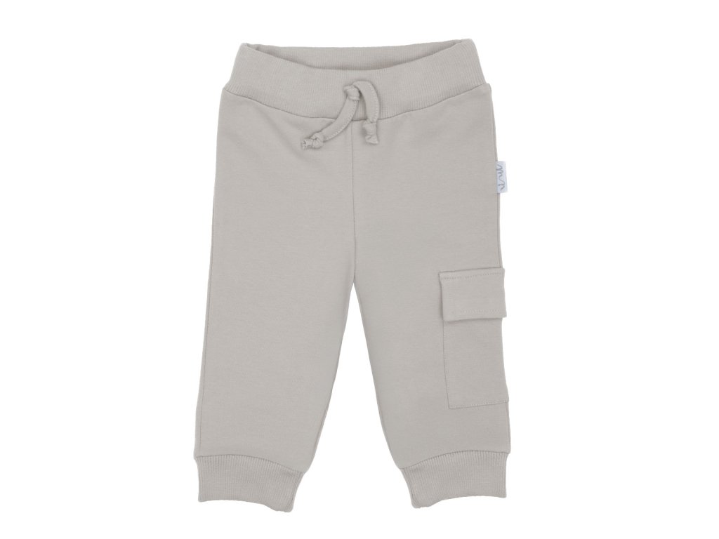 Módne bavlnené nohavice pre chlapca vyrobené zo sivej teplákovej bavlny s malým množstvom elastanu. Materiál je certifikovaný podľa Oeko-Tex Standard 100 Trustworthy textiles. Tento strih sa vyznačuje jednoduchým klasickým strihom. Na boku teplákov je použité vrecko. Pás a nohavice sú zakončené netlačiacim lemom. Predná časť je zdobená sťahovacou šnúrkou vo farbe nohavíc. Zloženie: 95% bavlna, 5% elastan.