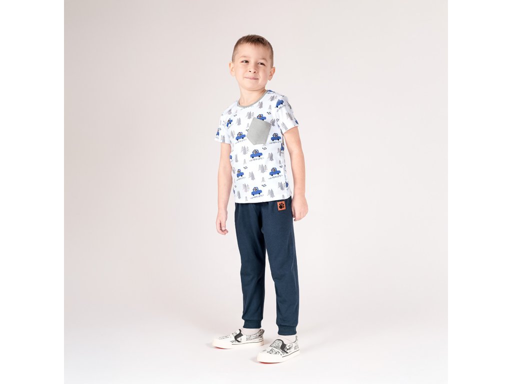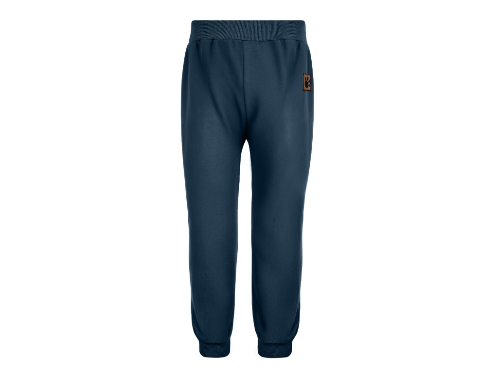 Tenké chlapčenské tepláky v najmódnejšom strihu. Vyrobené z materiálu v tmavomodrej farbe, na prednej strane majú nášivku so psou labkou. Materiál je elastický a priliehavý, vďaka čomu je zároveň veľmi pohodlný. Budú sa hodiť k mnohým jarno-letným outfitom. Zloženie: 92% bavlna, 8% elastan.